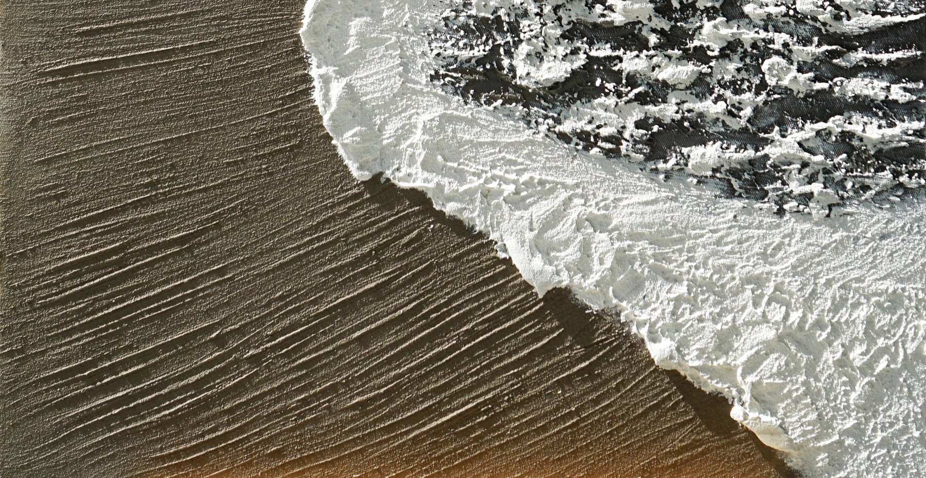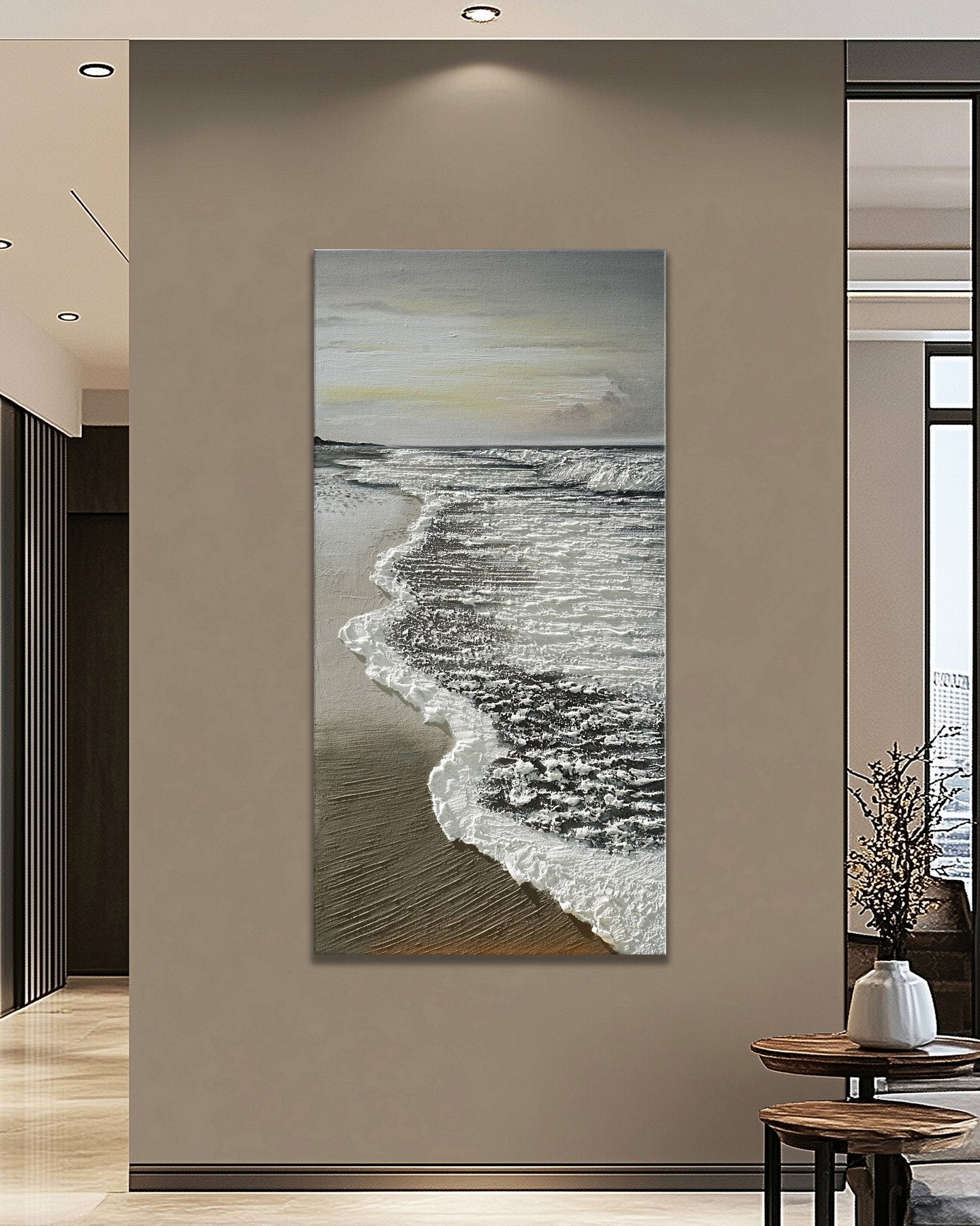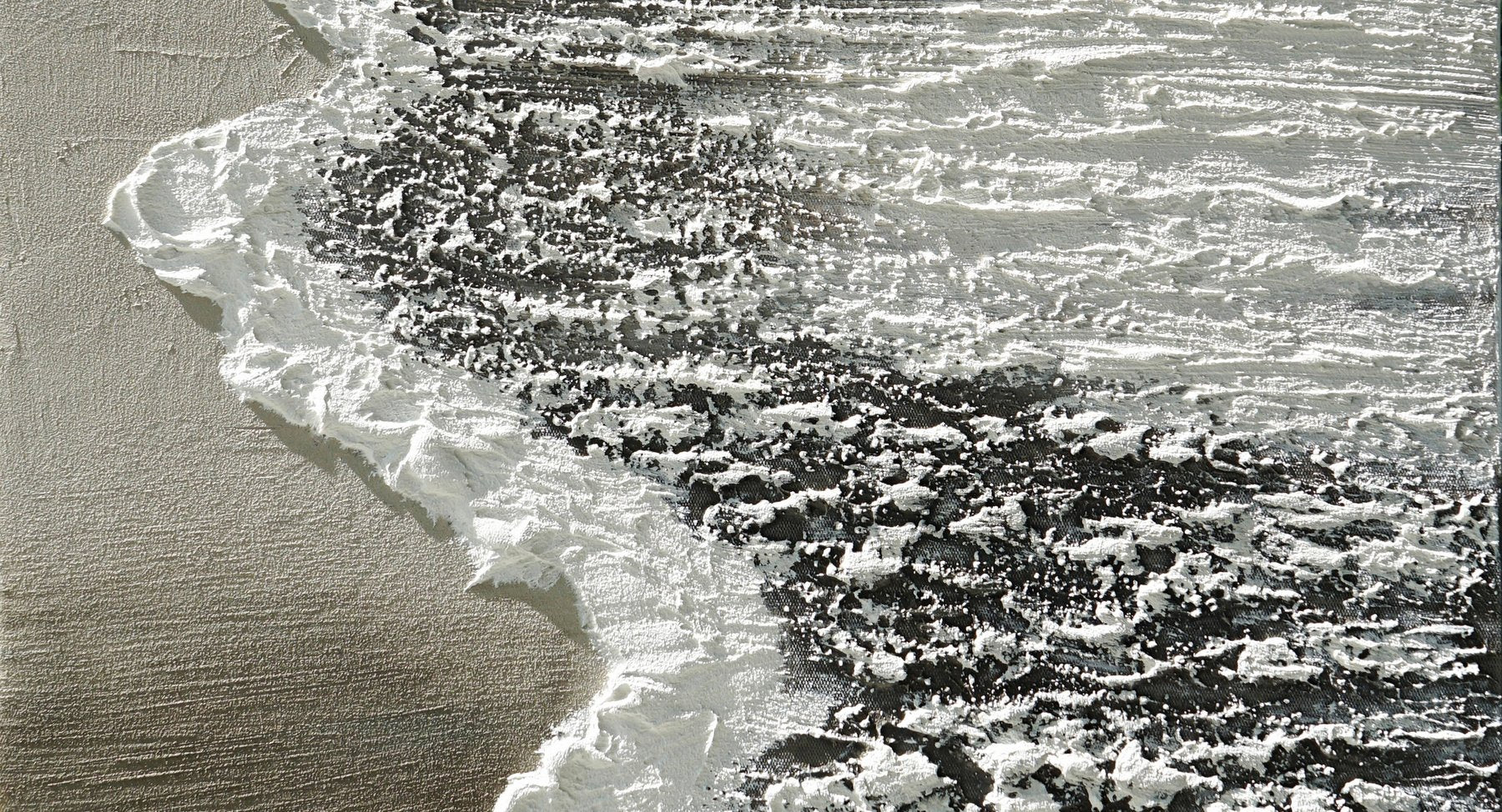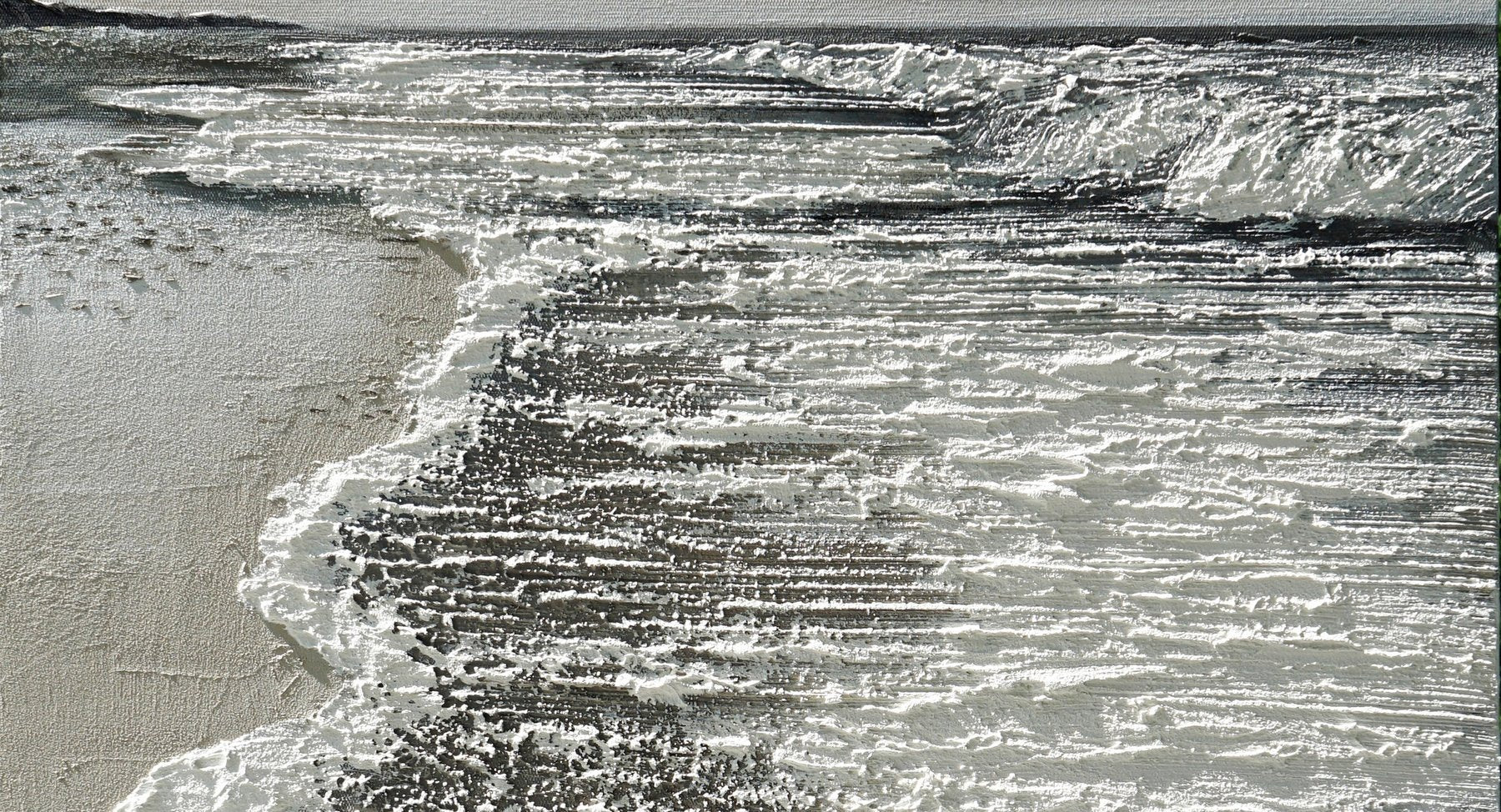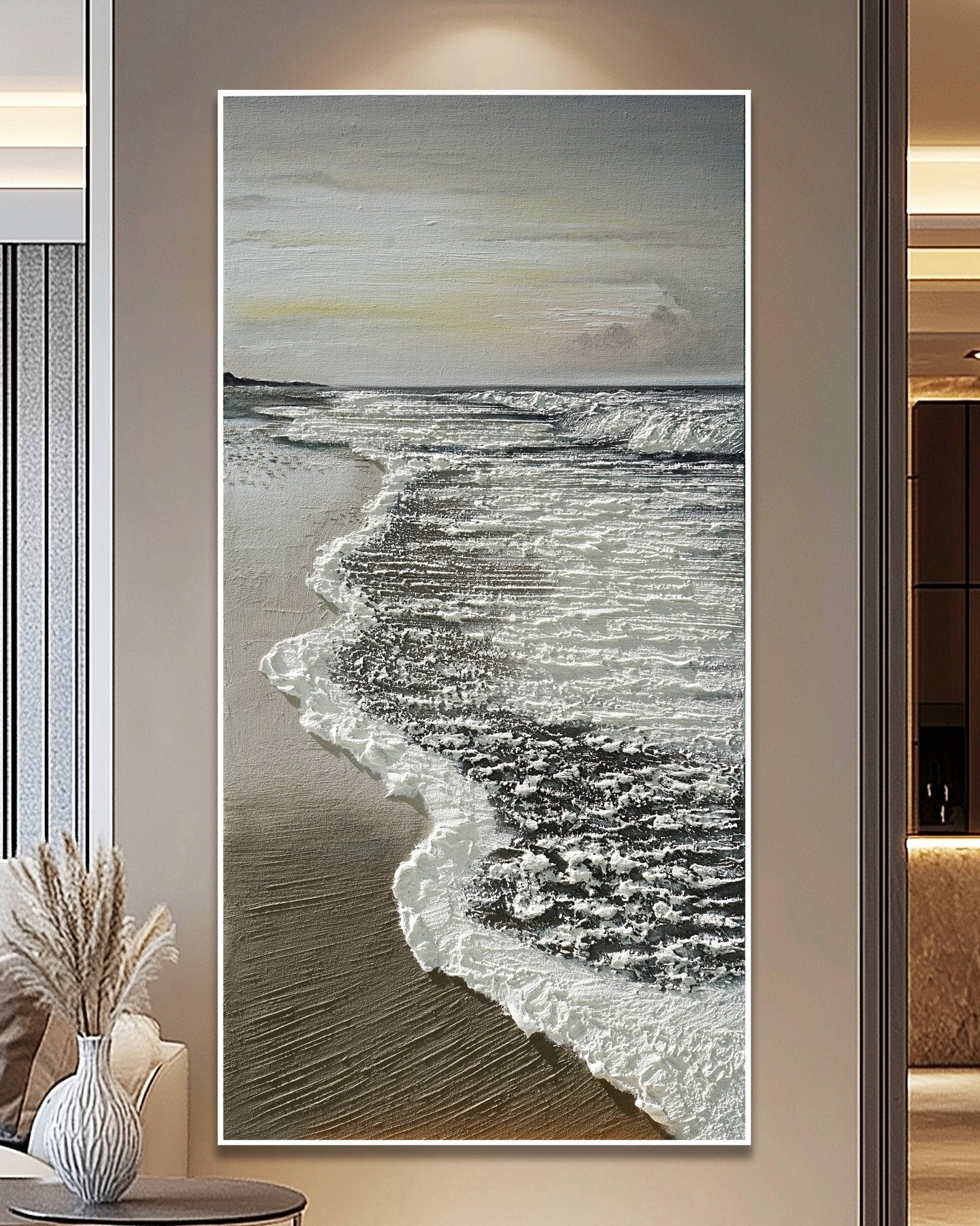 Une peinture acrylique apaisante de vagues douces caressant une plage de sable à l'aube. Des gris neutres et des ors doux créent une scène tranquille, mise en valeur par de délicates textures qui évoquent le rythme paisible du bord de l'océan.