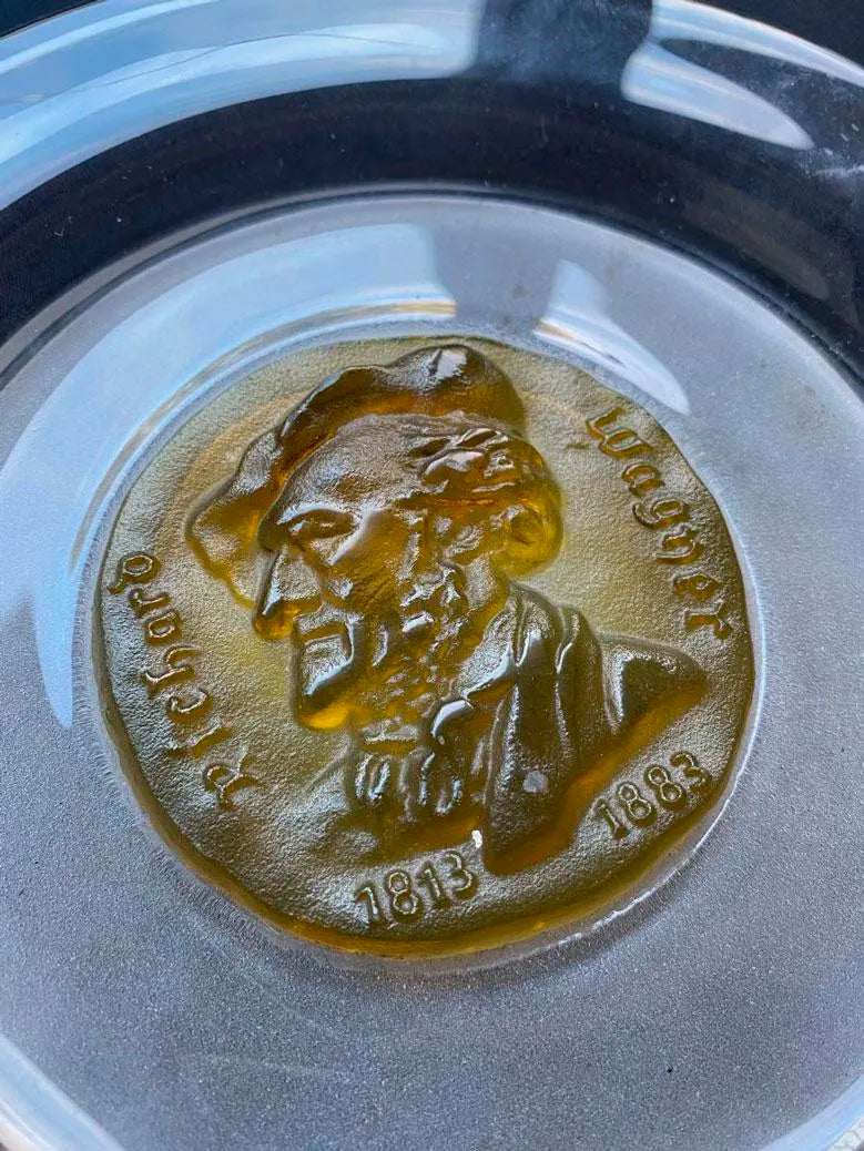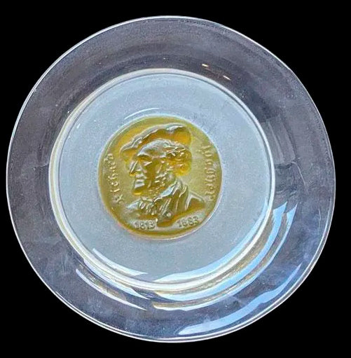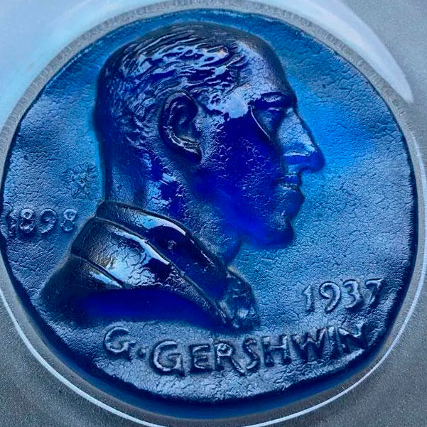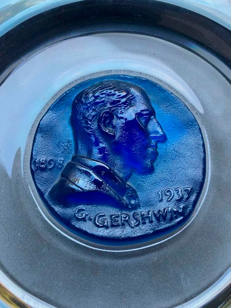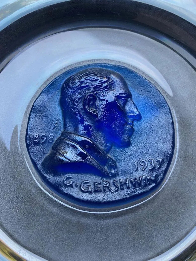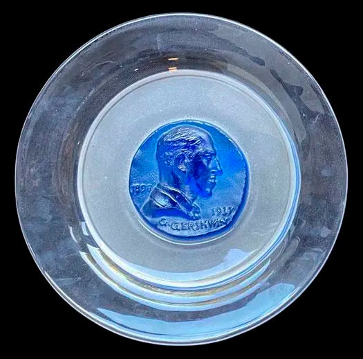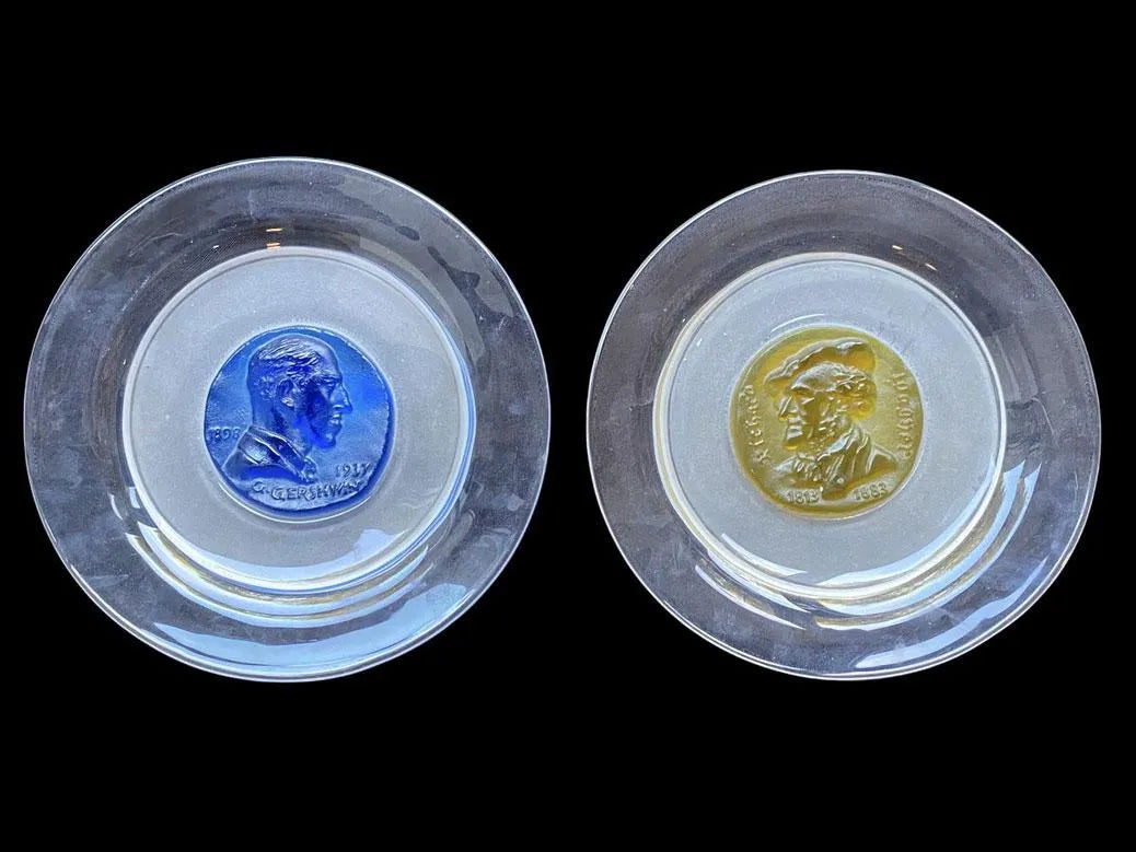 Ensemble de deux assiettes commémoratives à médaillons centraux bleu et jaune figurant les profils de GEORGES GERSHWIN et RICHARD WAGNER en cristal poli, dépoli et pâte de verre