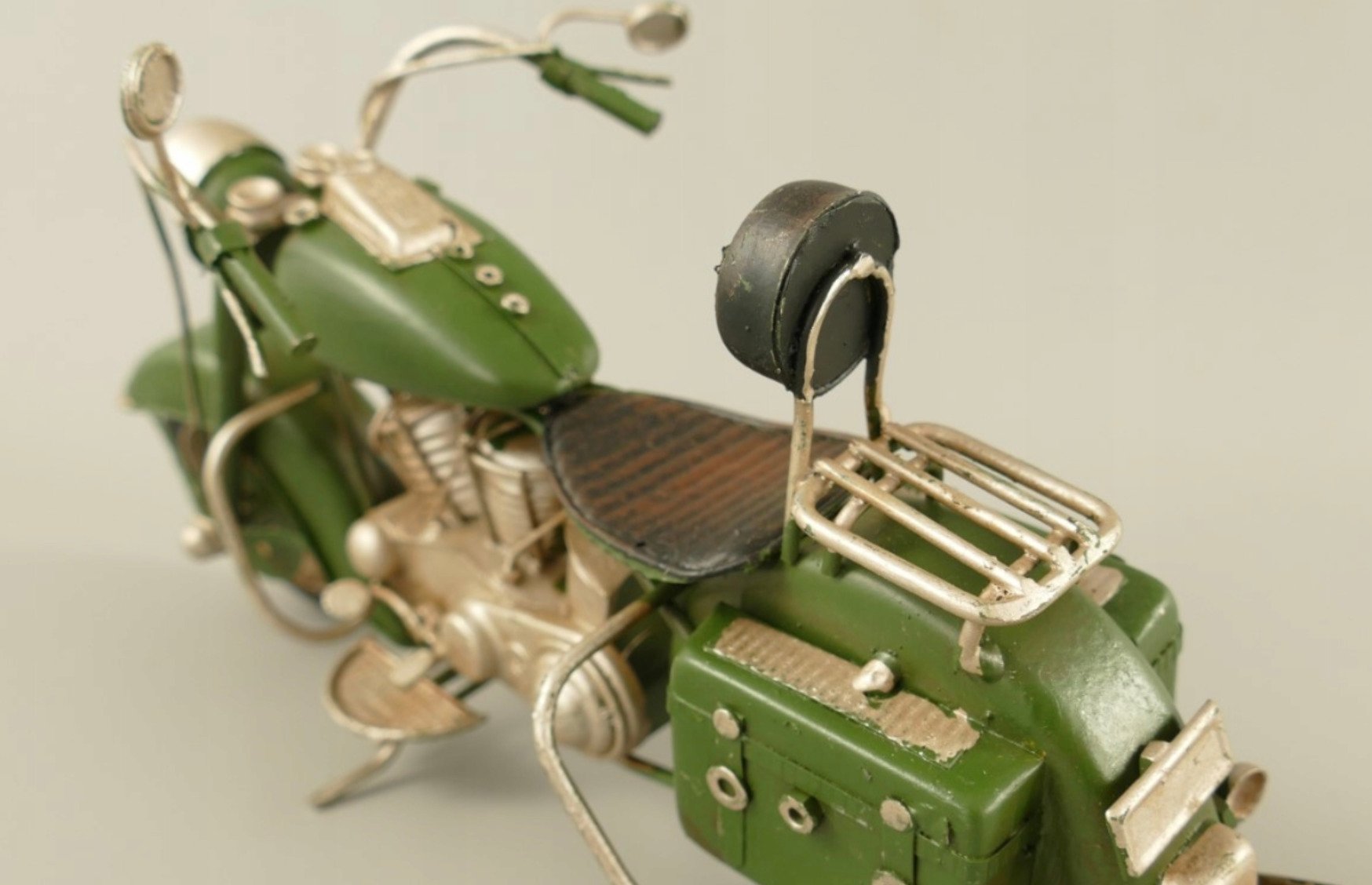 Moto type Harley militaire vintage en tôle, réalisée avec soin.