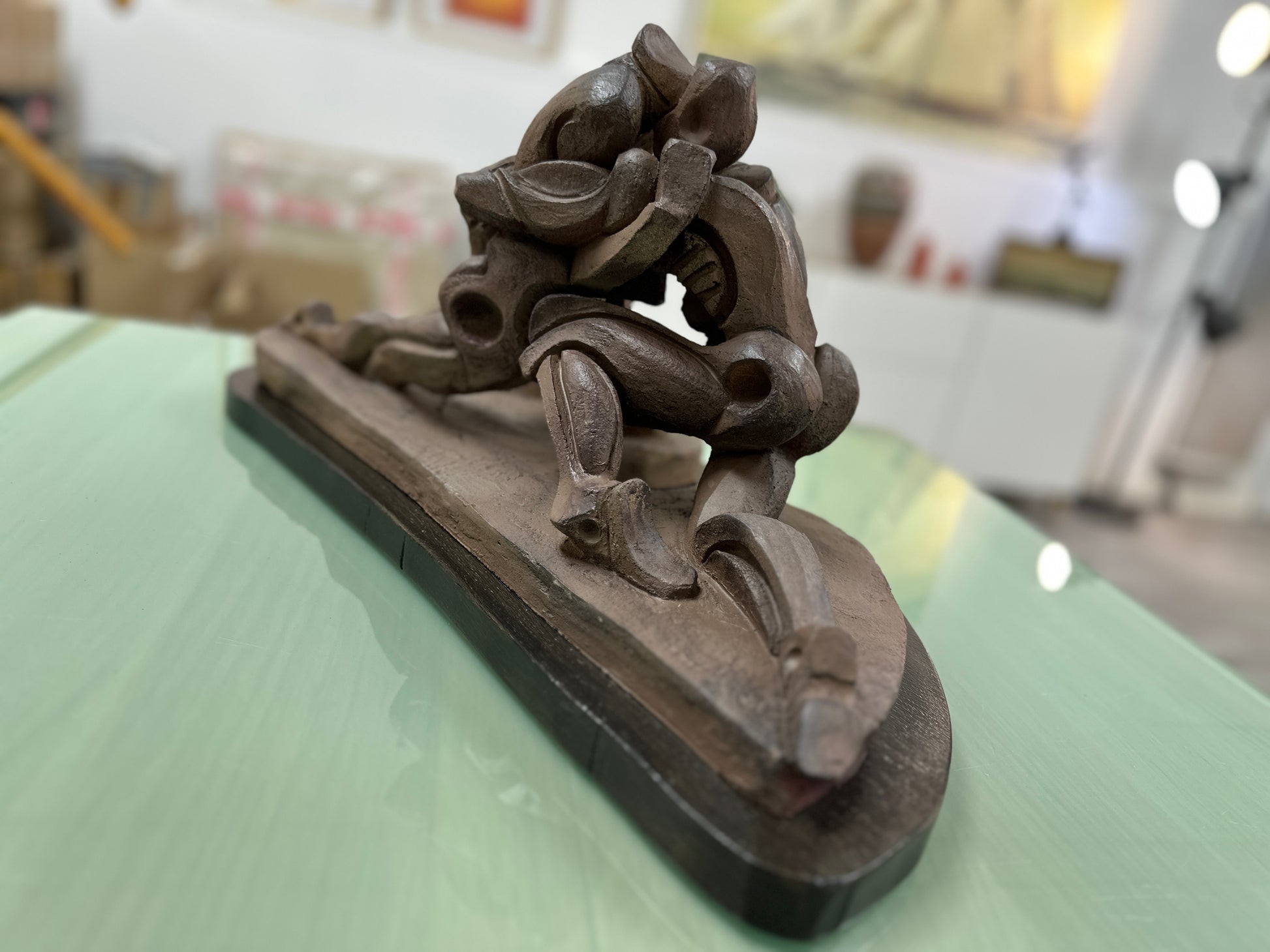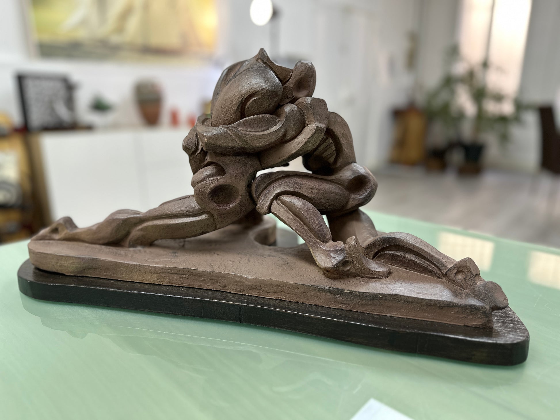 Cette sculpture a été réalisée en terre cuite réfractaire, un matériau plus résistant que la terre cuite traditionnelle et signée à la main, c'est un exemplaire unique et représente deux lutteurs enlacés dans l'acte de se battre même si à certains points de vue les corps semblent s'embrasser et se fondre dans une seule masse de muscles et de volumes est une sculpture très dynamique