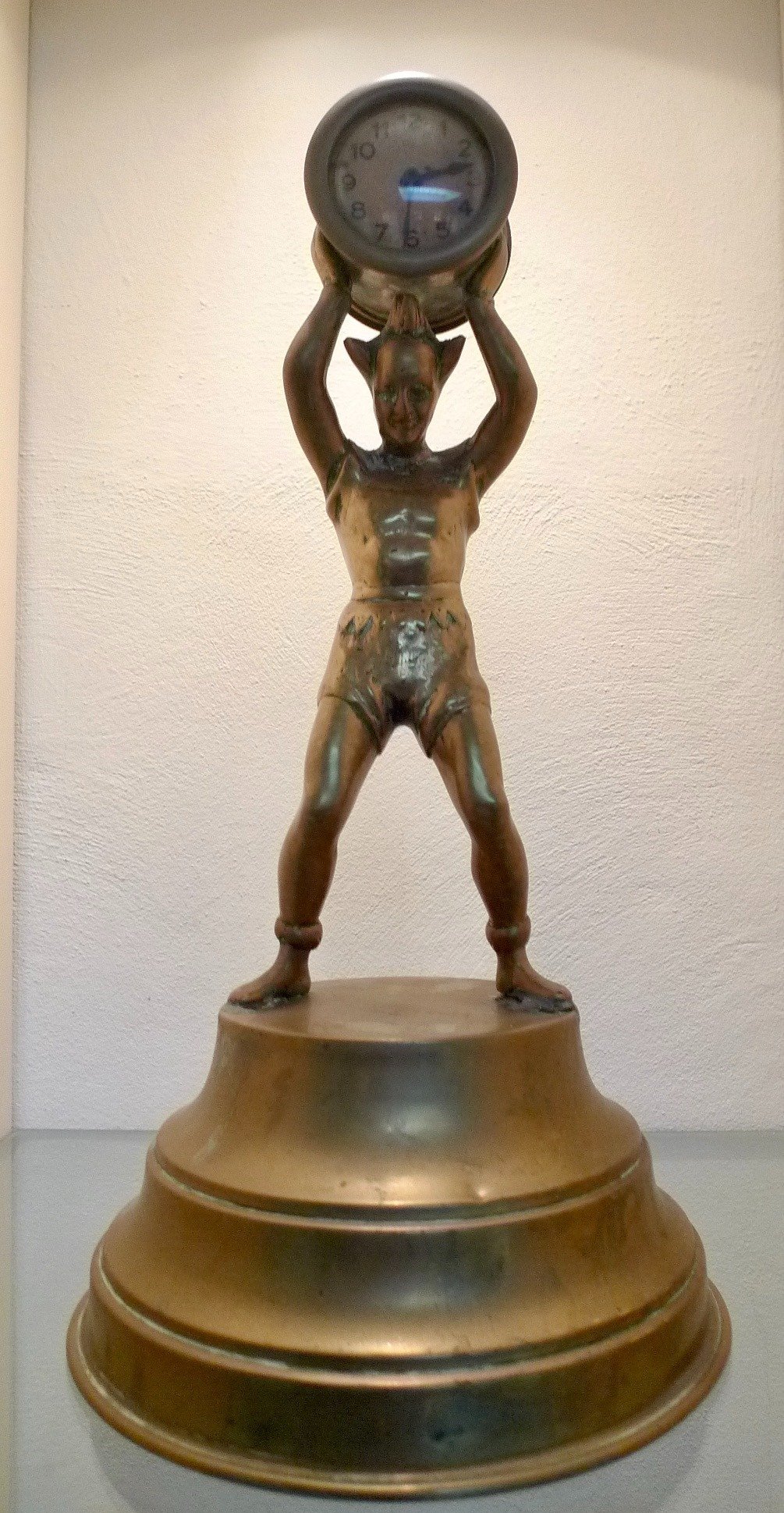 Personnage en bronze original en porte-horloge sur socle en cuivre.
